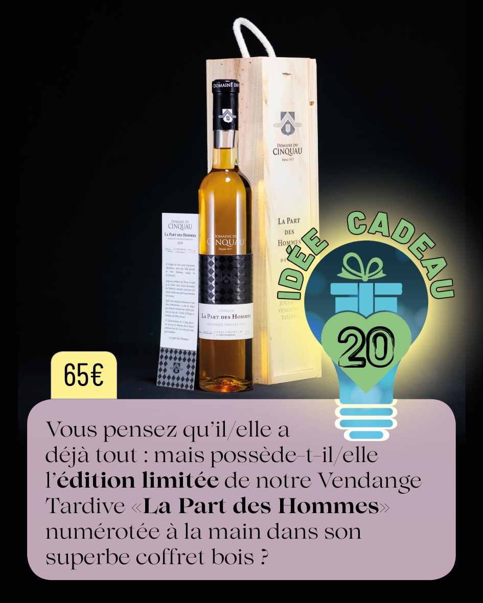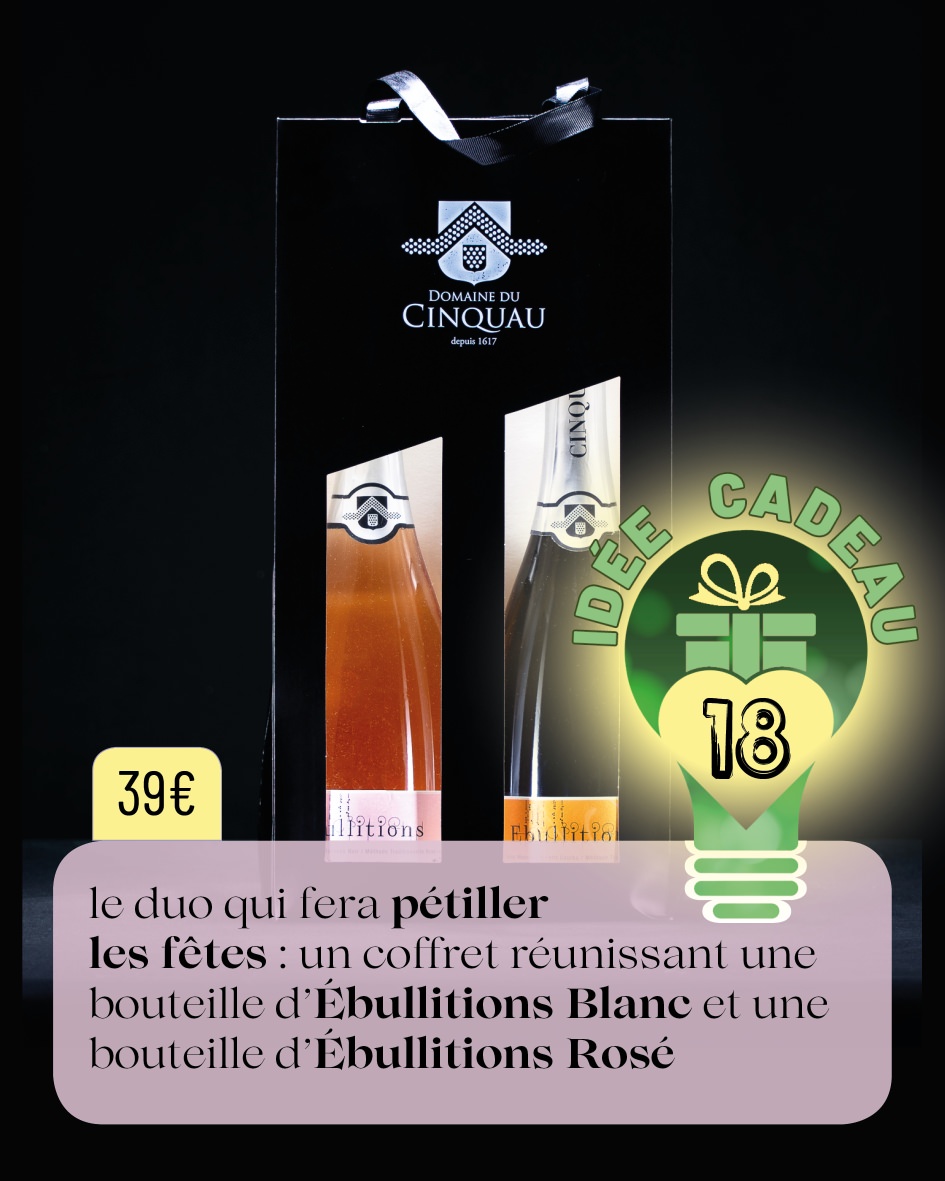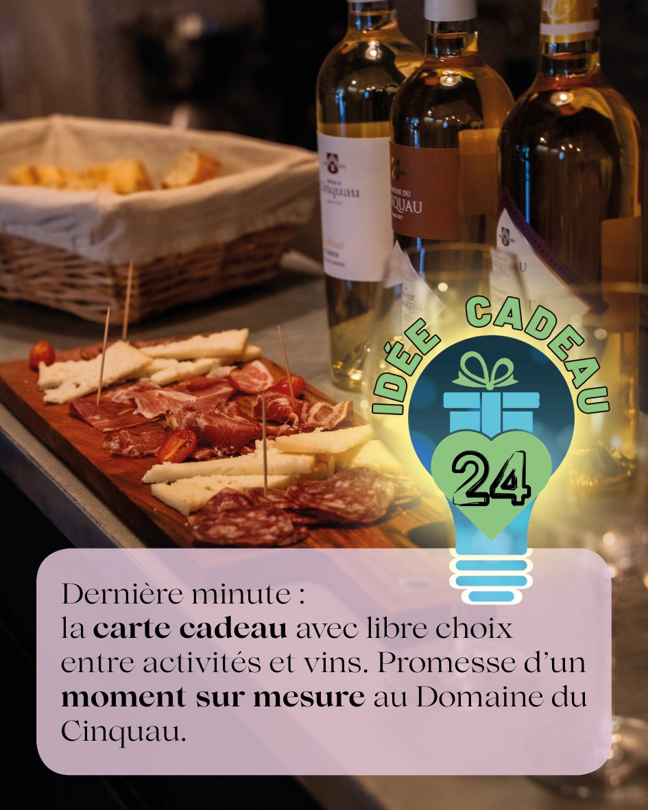 Le Domaine du Cinquau vous propose un panel d’une vingtaine de cadeaux à offrir lors de ce Noël ou toute l’année et à s’offrir. Des idées autour du vin, bien entendu, mais aussi autour de nos activités oenotouristiques ou bien nos verres siglés ou encore un accès à notre espace détente et bien-être, le choix est vaste ainsi que le budget. Il y a en a pour tous les gouts !